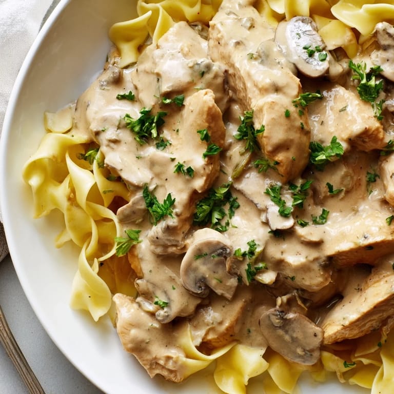Save to Pinterest My neighbor knocked on my door one February evening holding a borrowed cookbook and asking if I had any paprika. She was attempting stroganoff for the first time and panicking mid-recipe. I ended up in her kitchen, guiding her through the sauce while we sipped wine meant for the pan. That night, over bowls of creamy chicken and mushrooms, I realized how a simple dish could turn a regular Tuesday into something warm and memorable.
