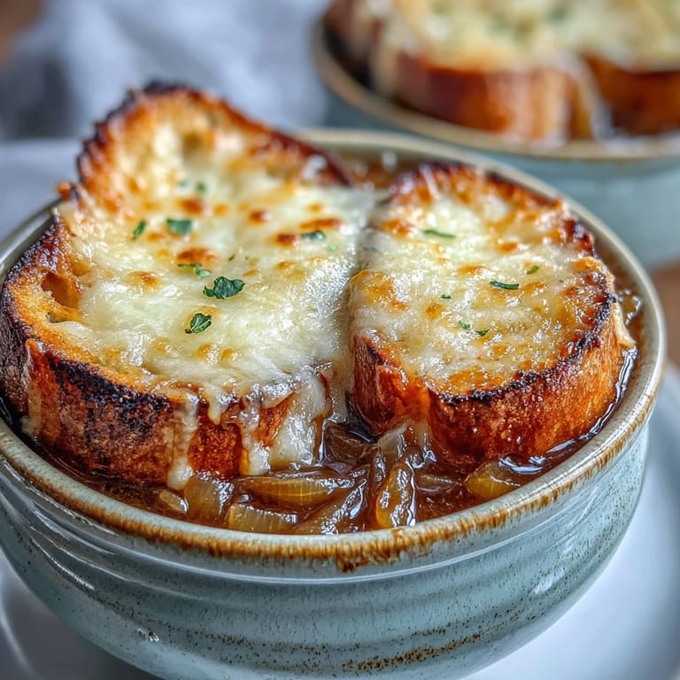 Save to Pinterest Classic French Onion Soup is a rich, comforting staple of French cuisine, celebrated for its deeply caramelized onions and savory broth. This medium-difficulty recipe yields 4 servings of a timeless dish topped with toasted baguette and a signature layer of melted, bubbly Gruyère cheese.