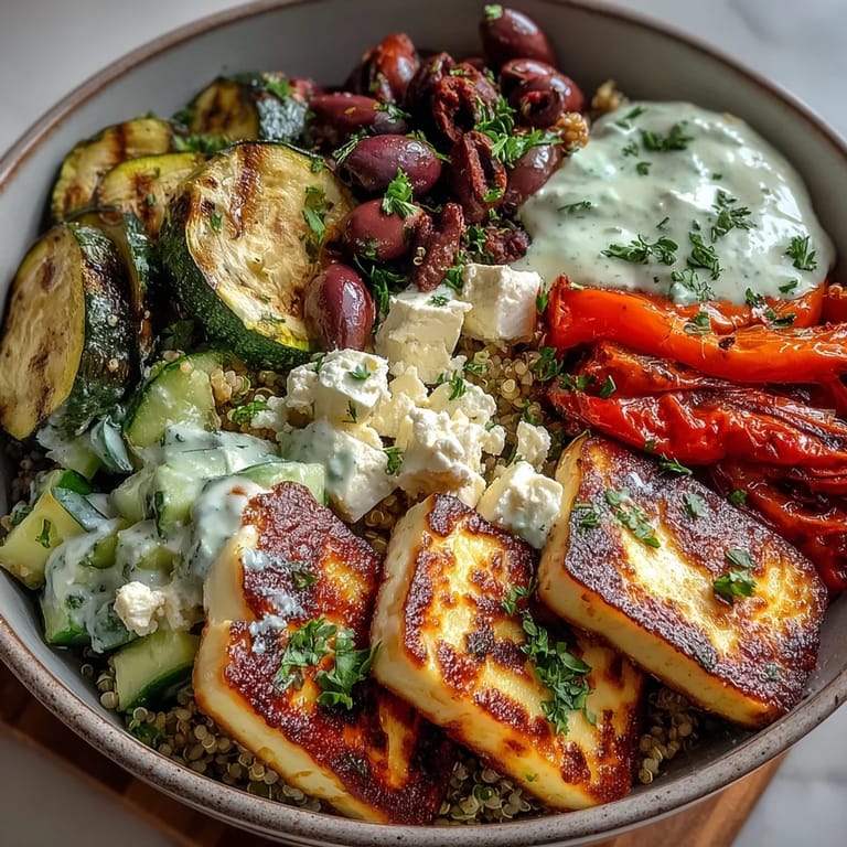 Save to Pinterest My neighbor knocked on my door one July evening with a basket of zucchini from her garden, and I had no plan for dinner. I started pulling things from the fridge—leftover quinoa, a block of halloumi, some wilting peppers—and fired up the grill pan. What came together in under an hour felt like a small vacation on a plate, bright and smoky and impossibly satisfying. I've been building bowls like this ever since, tweaking the vegetables with the seasons and never getting tired of that first bite.
